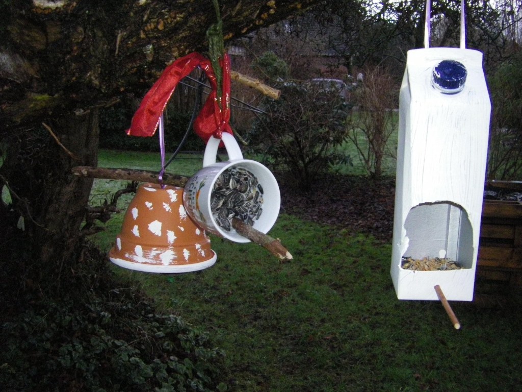 Vogelfutterglocke Hierfür bekommt Ihr einen kleinen Tontopf und einen Meisenknödel. Die Töpfe können bemalt werden – am einfachsten mit Wandfarbe. Kleine Mengen zum Betupfen können wir mitliefern. Sehr gut geeignet für kleine Kinder.