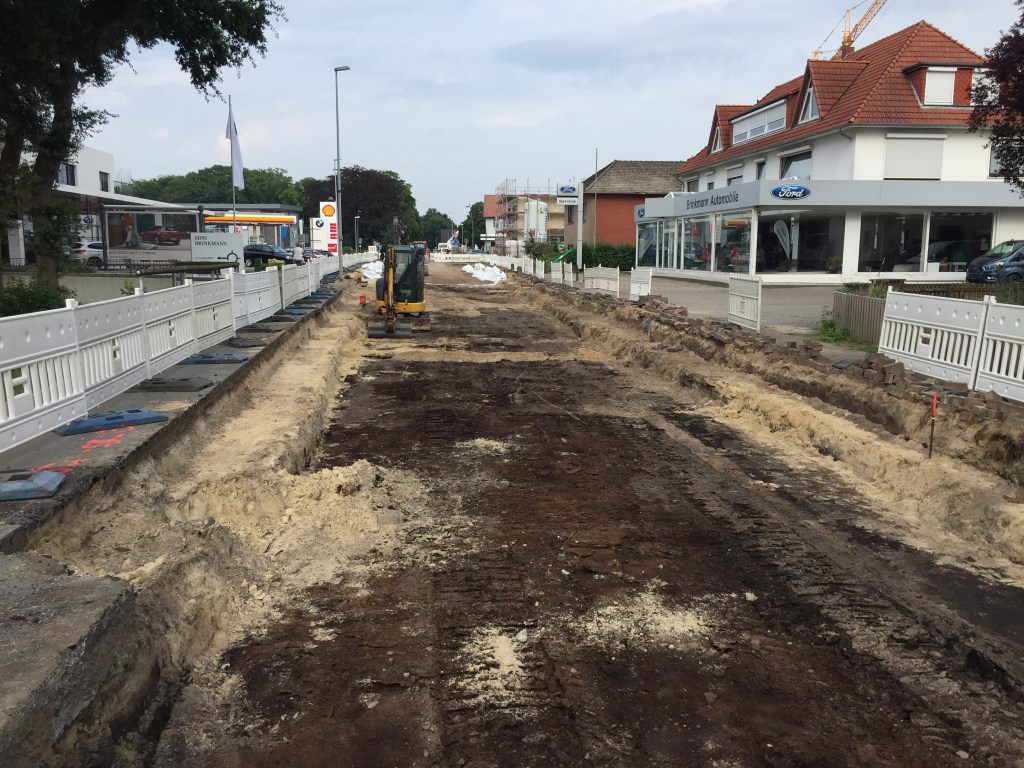 Ansicht aus Richtung Worphauser Landstraße.Verkaufshäuschen von Familie Stelljes am neuen Standort.Erdarbeiten kurz vor dem Kreisel.Im Straßenbau wird bei weichem Untergrund ein Vlies eingebaut.Auf den Bildern lässt sich gut erkennen, dass nicht nur die oberste Schicht der Straße erneuert wird.