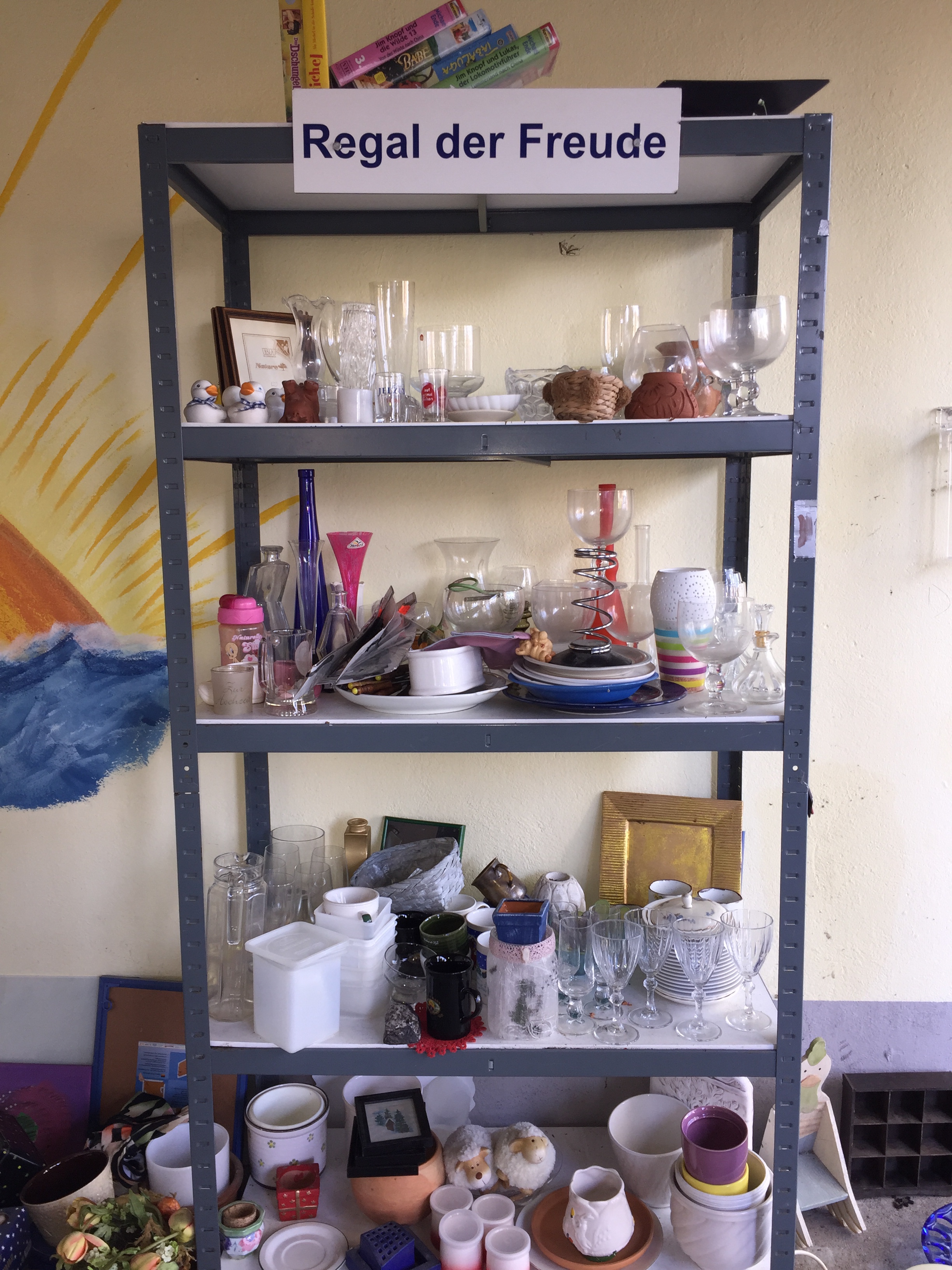 Das Regal der Freude, mein absoluter Tipp Nummer eins: Es steht im Unterstand direkt am Gemeindehaus in Grasberg und ist 24/7 erreichbar. Es können alle möglichen Dinge dort hineingestellt werden. Einschränkung: Sie müssen sauber und NICHT defekt sein. Bitte keine Kleidungsstücke, Elektrogeräte, angebrochene Kosmetikartikel und Bücher dort hineinlegen.