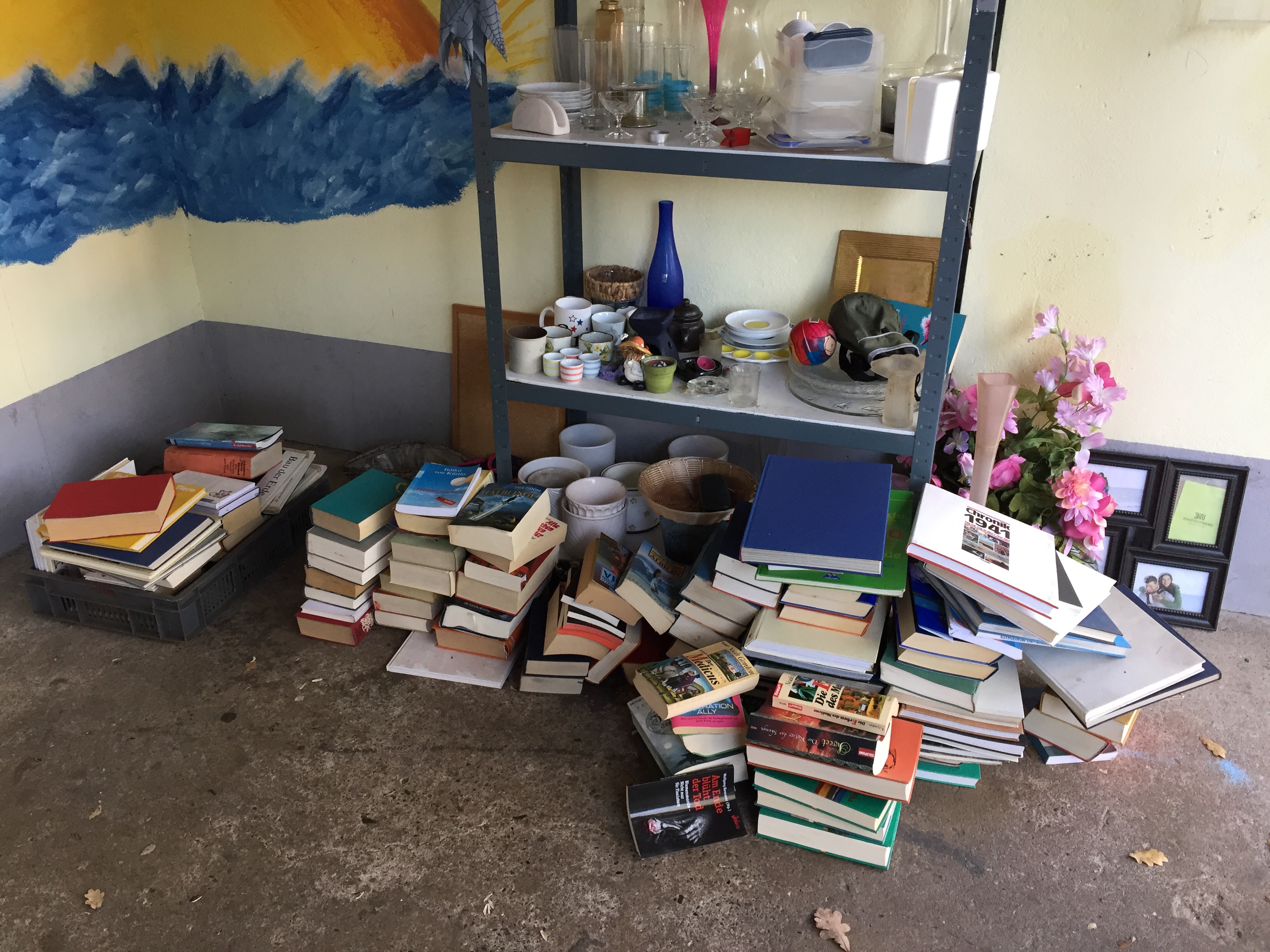 gerade kam ich am Regal der Freude vorbei. Leider bereitet der Anblick überhaupt keine Freude! Irgendwer hat das Regal als Entsorgungsmöglichkeit entdeckt. Die Frauen, die sich ehrenamtlich um das Regal kümmern, haben ein Schild aufgehängt. Trotzdem hat jemand eine große Menge Bücher auf den Boden direkt vor dem Regal abgelegt. Bei diesen Temperaturen werden die Bücher feucht, wenn sie dort liegen. Muffige Bücher nimmt sich niemand mit nach Hause, sie werden ein Fall für das Altpapier!