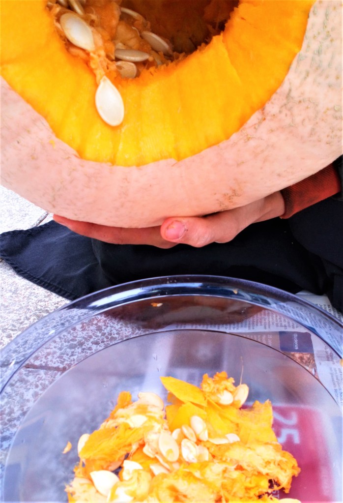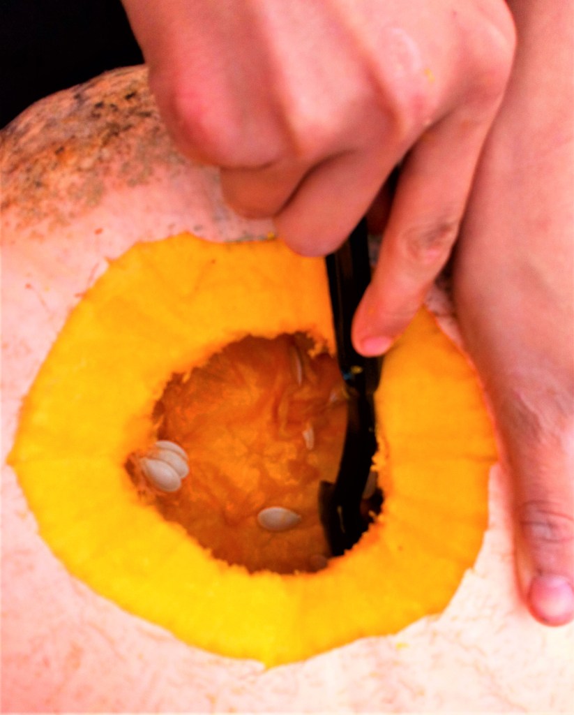 Zuerst wird der Deckel abgeschnitten. Danach hebt man mit dem Löffel das weiche Innere mitsamt den Kernen heraus. Die Kerne können getrocknet und im nächsten Frühjahr ausgesät werden. Das restliche festere Fruchtfleisch des Kürbis wird abgeschabt, für eine leckere Kürbissuppe oder ein Kürbisbrot. Auf den ausgehöhlten Kürbis kann nun das Kürbisgesicht mit Edding vorgezeichnet und anschließend vorsichtig ausgestochen werden. Tada – fertig!